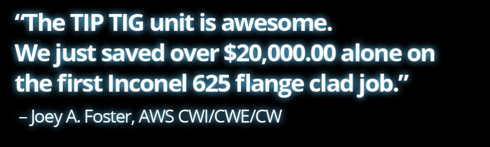 The TIP TIG welding process is a very unique hotwire GTAW welding process that uses our patented wire feed technology. The benefits of our system will provide the highest quality, highest deposition rates with the lowest possible heat input values consistently delivering the greatest metallurgical results on all alloys and… it has also proven to provide the lowest possible hexavalent chrome weld fume emissions which have been measured as “Undetectable”. Unlike nearly all other hot wire TIG welding processes, it can be operated both manually in all positions, as well as with our patented automation systems. A widely recognized benefit we deliver is the reduction in labor cost associated with costly rework and training. Simply put ….. It’s just simple to use, teach and to learn!